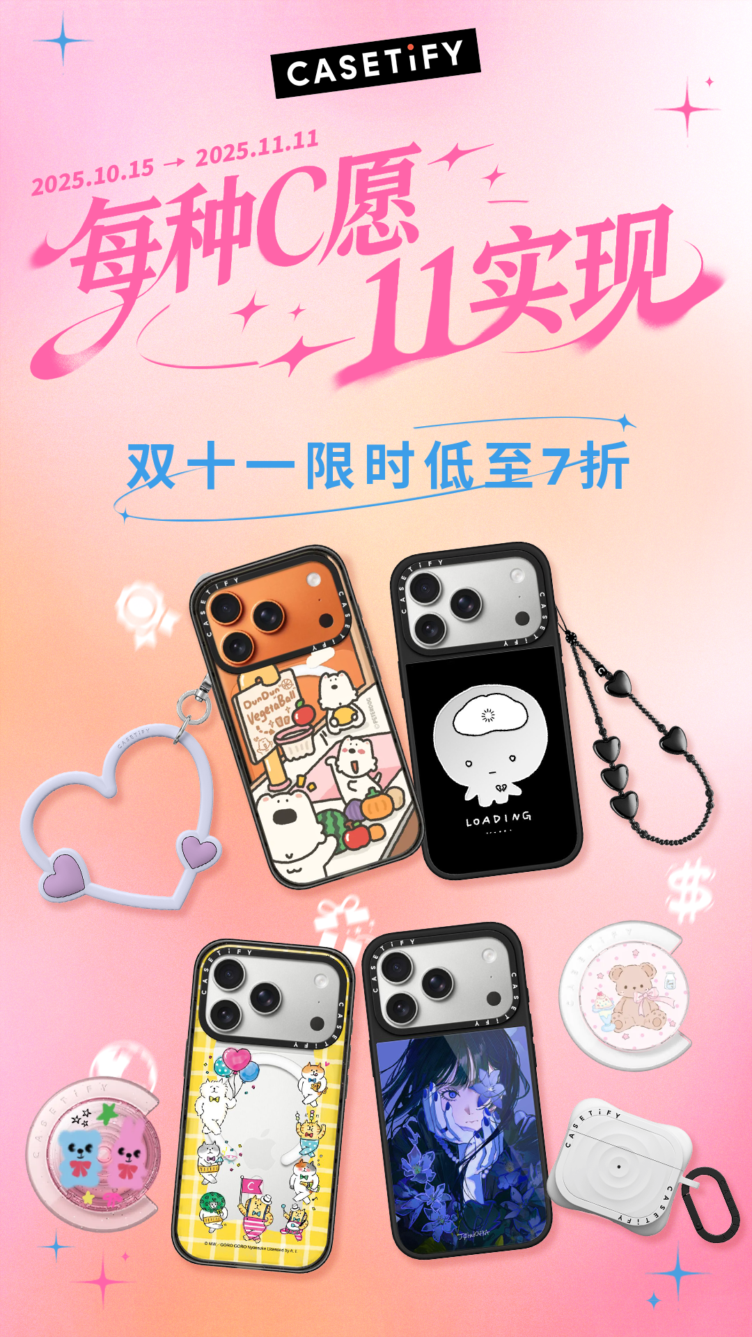 每一种C愿,都用不同的方式来兑现!当「新 iPhone」遇上「新鲜感」,满足追求新鲜的你;限量产品与IP联名系列,属于钟爱小众、热爱收藏的你;多功能电子配件的自由组合,适合热爱潮流百搭的你;而质感满分的波漾之选,则献给极简主义的你。无论是哪一种情绪、哪一种期待,CASETiFY 都希望用贴近生活的创意设计,让每个你都能在双十一找到独属的个性表达。